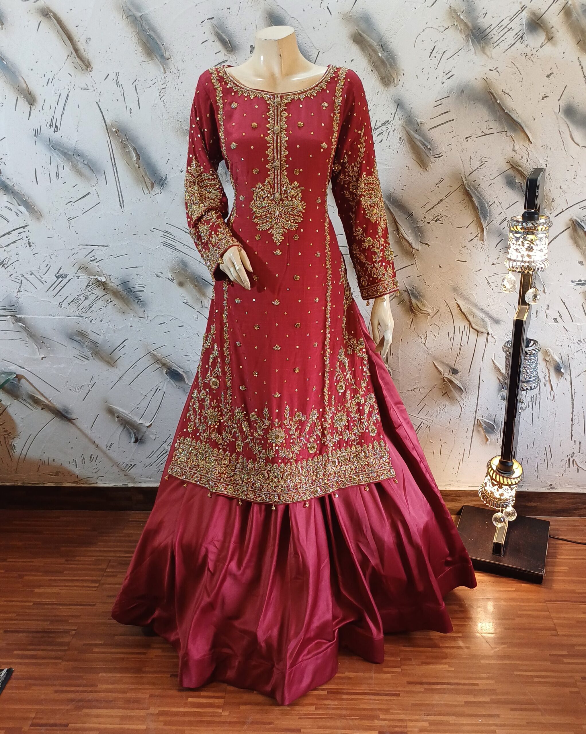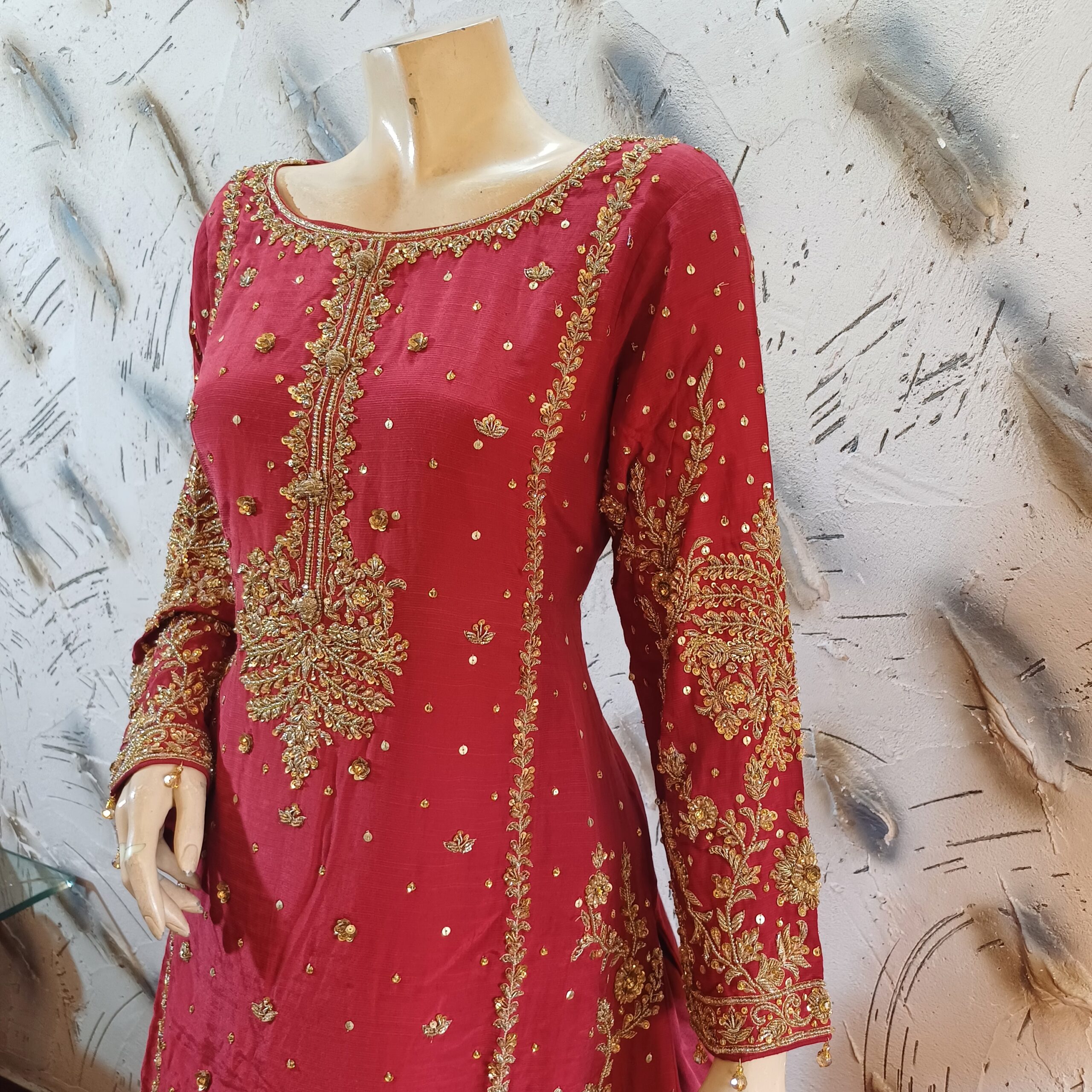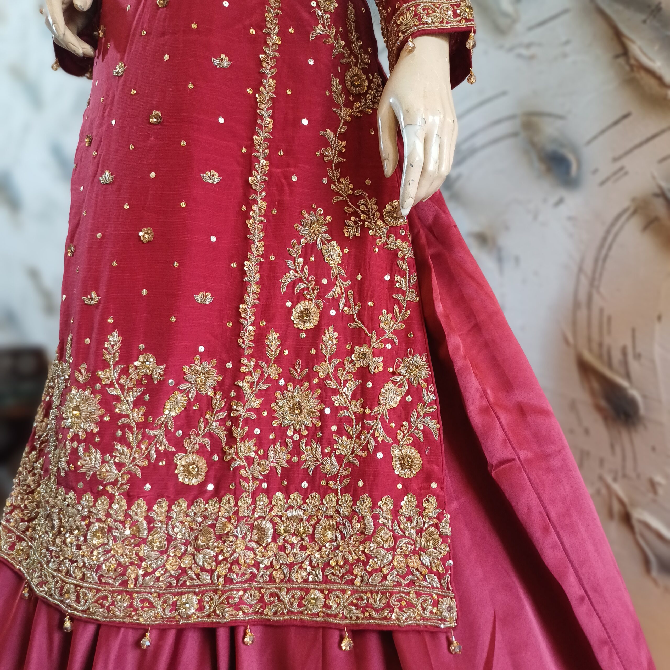“This exquisite shirt showcases detailed hand embellishment using kora, salma, and dabka techniques, further adorned with zircons to create a refined, glittering effect. The intricate craftsmanship is rendered in luxurious shades of gold over a rich maroon base. Color combinations and design elements can be customized to perfectly suit your occasion and personal style.”