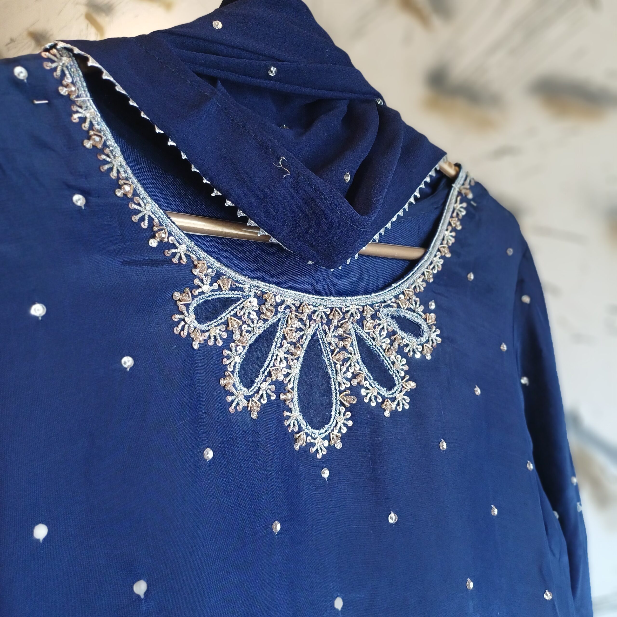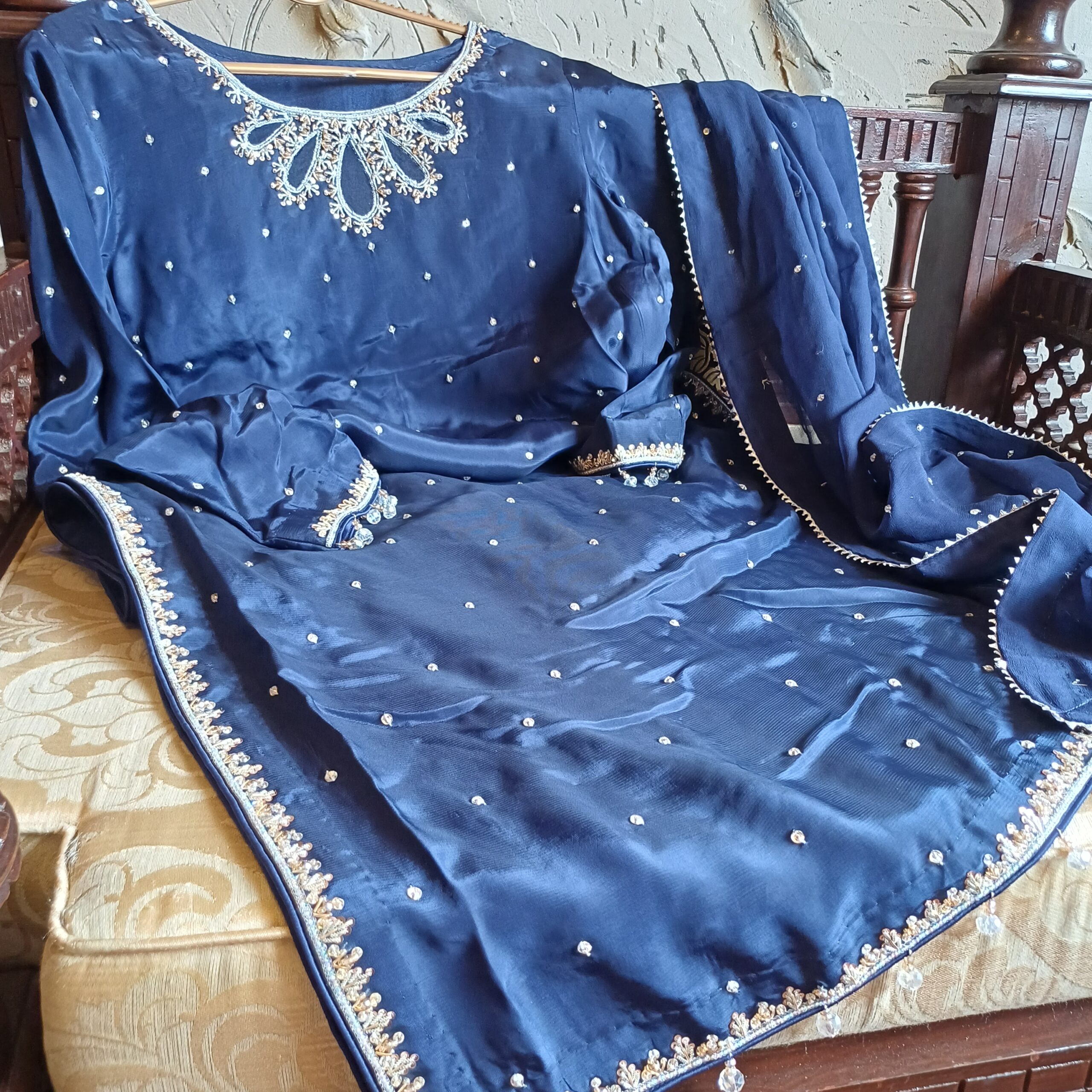 This design has a neat neckline with side chalks that give it a nice shape. The daman and sleeves have delicate lines for a clean and elegant look. Crystals are added at the end to give a soft, pretty shine. It’s a simple yet beautiful style for any occasion.