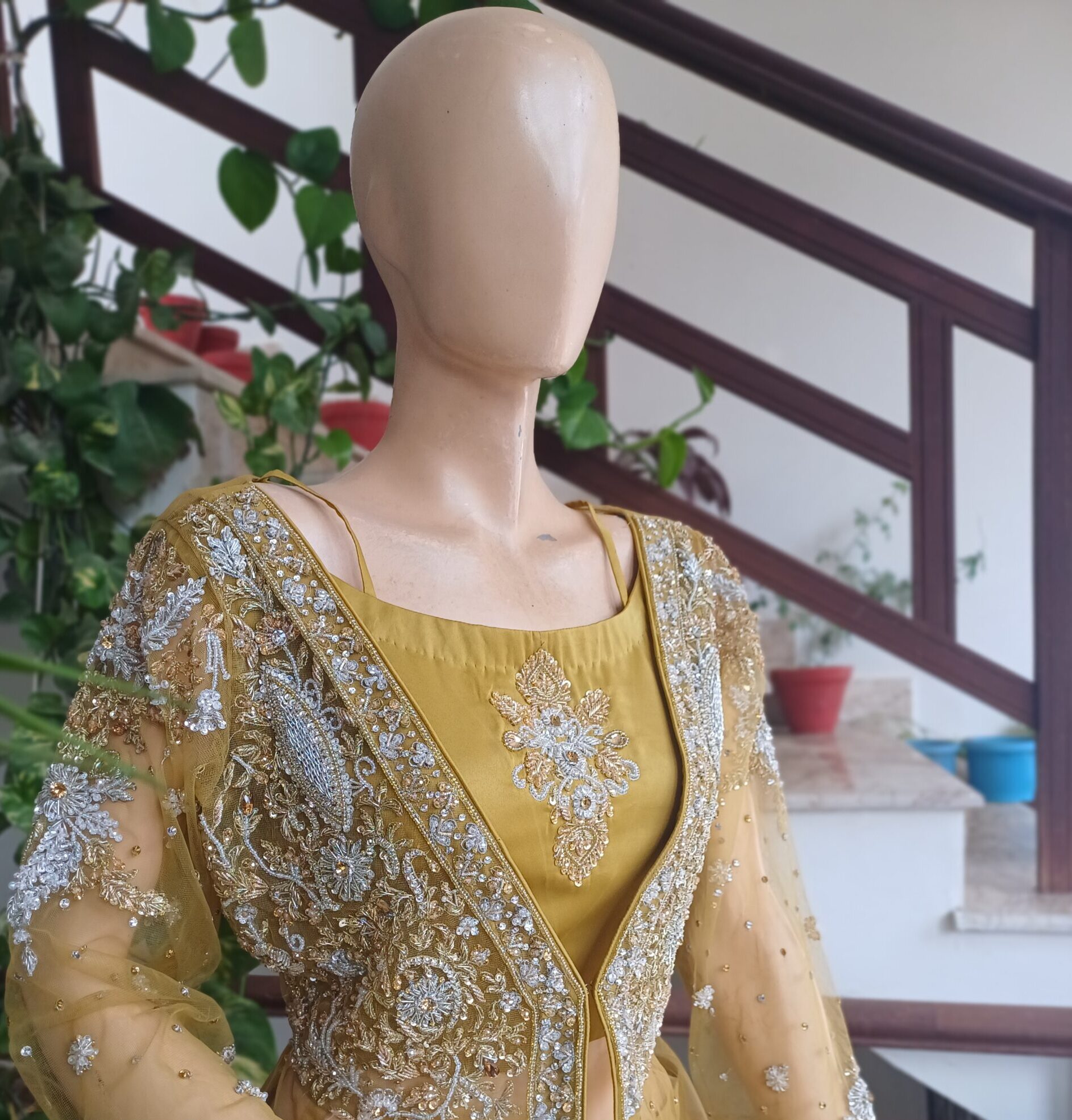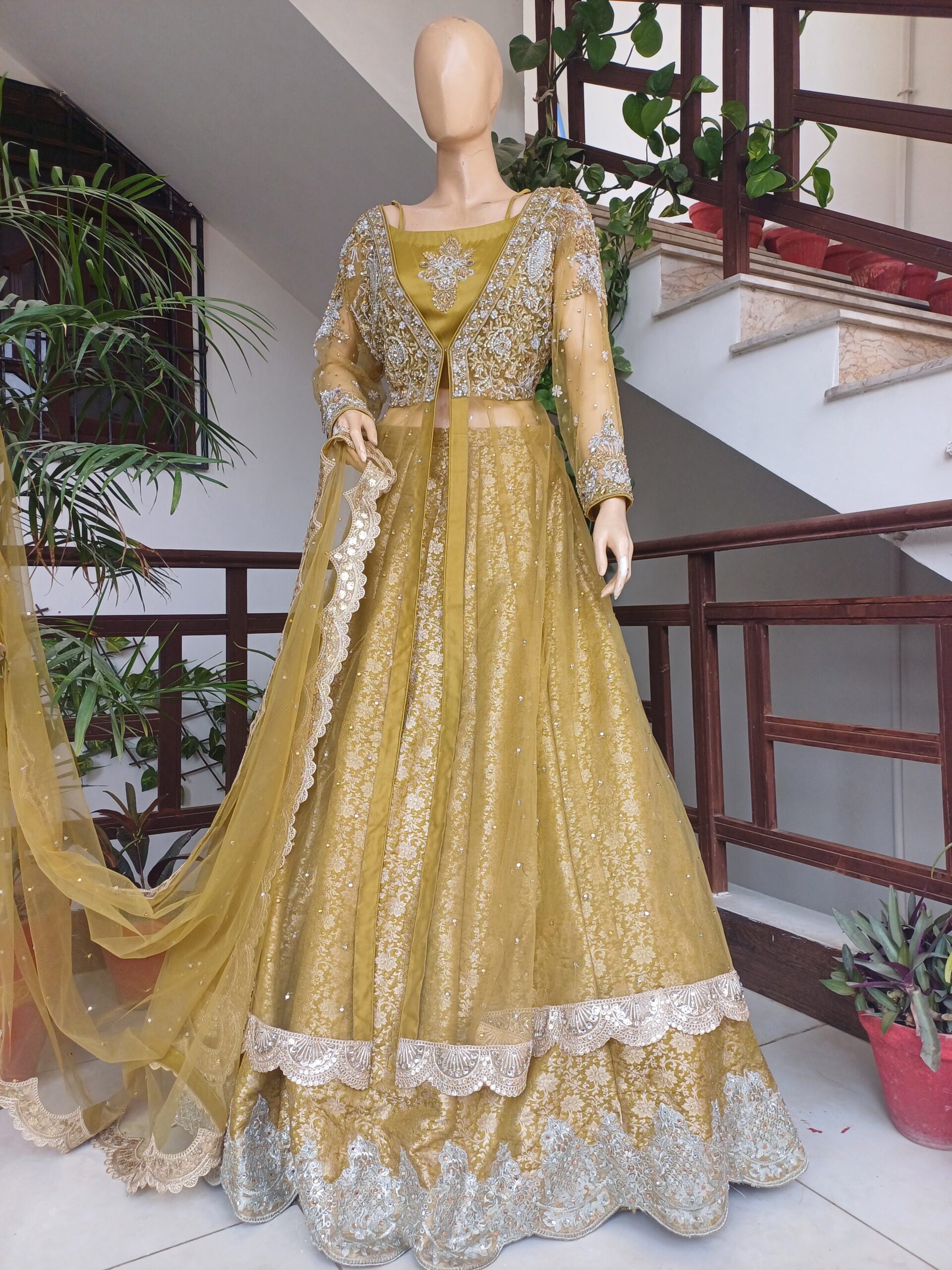 This beautiful outfit features a dusty olive net frock paired with a Banarasi lehnga, creating a rich and traditional look. The dupatta is finished with a four-side border, adding a graceful touch. The frock’s body is adorned with silver and white gold work, giving it a soft, festive shine. It’s a perfect choice for a mehndi function, blending elegance with tradition.
