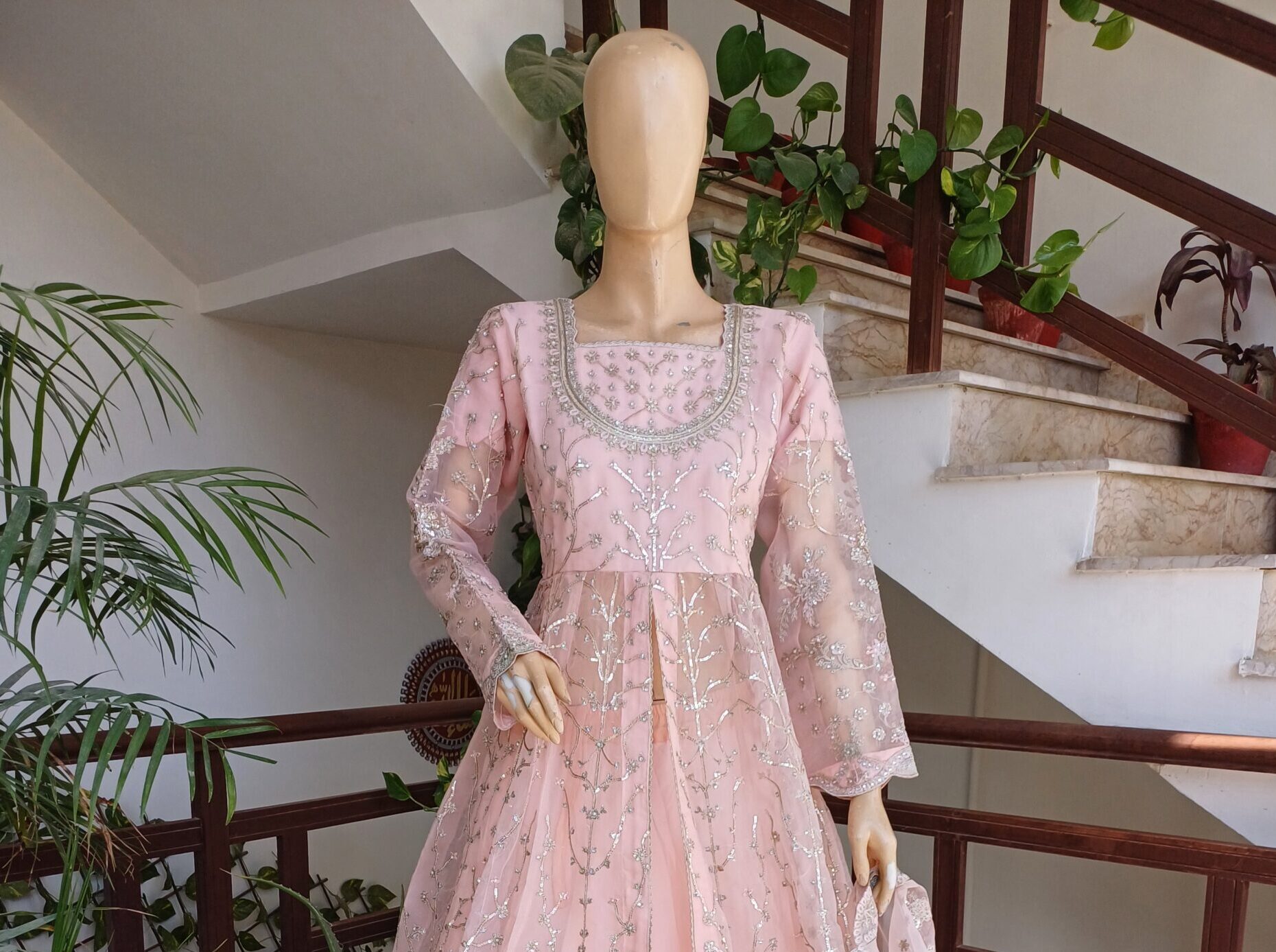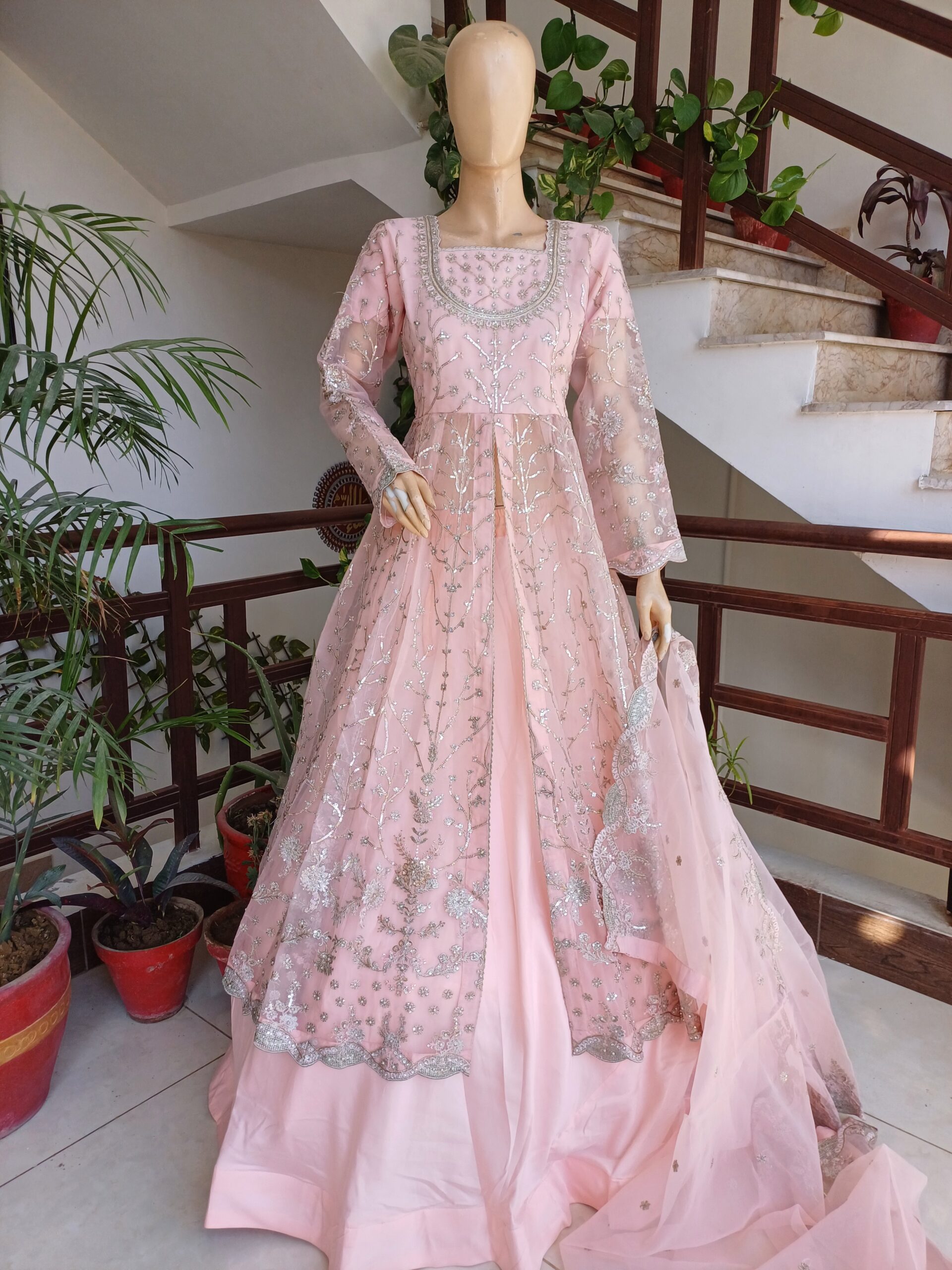 “A timeless front-open gown frock paired with a gracefully flared lehenga, adorned in ethereal white gold and copper gold zari embroidery. Delicate sequins and mirror accents catch the light with every movement, weaving subtle sparkle into every detail. The look is completed with a sheer dupatta, finished with intricately embroidered scalloped edges—an ensemble made for unforgettable moments.”