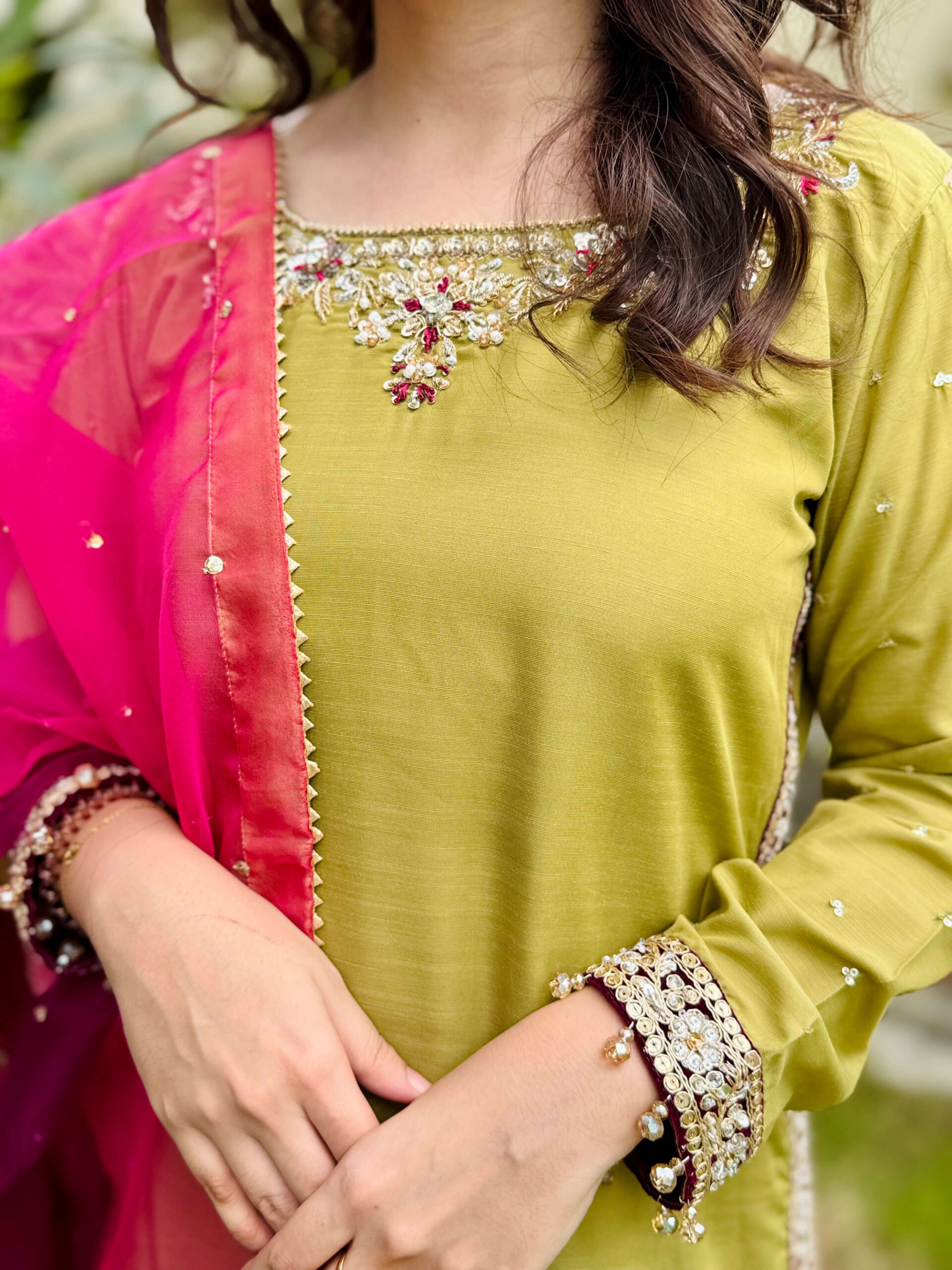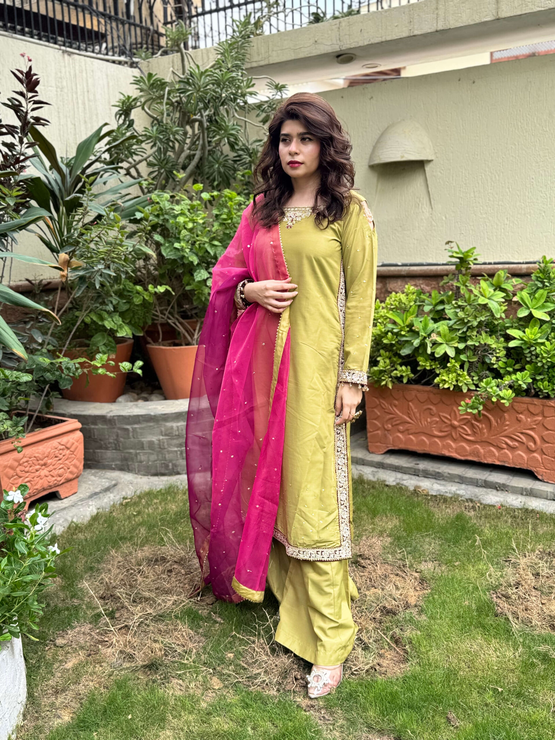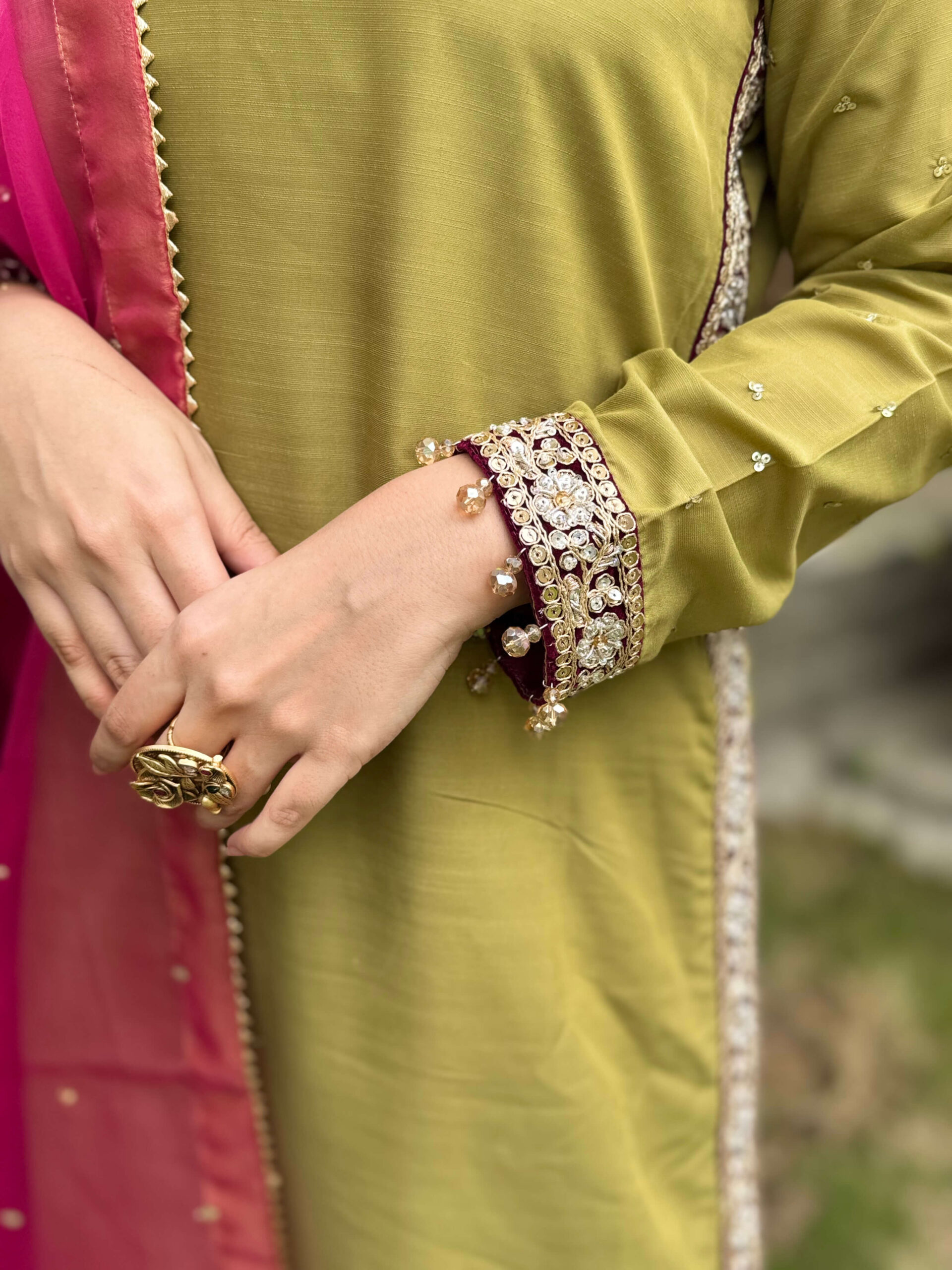 This elegant ensemble features a rich dhani green shirt adorned with intricate embroidery along the neckline, adding a touch of traditional charm. Delicate work continues along the sides of the shirt and the chalks (side slits), enhancing the silhouette with fine detailing. Paired beautifully with a dual-toned dupatta in shades of pink and purple, the contrast brings vibrancy and balance to the outfit.