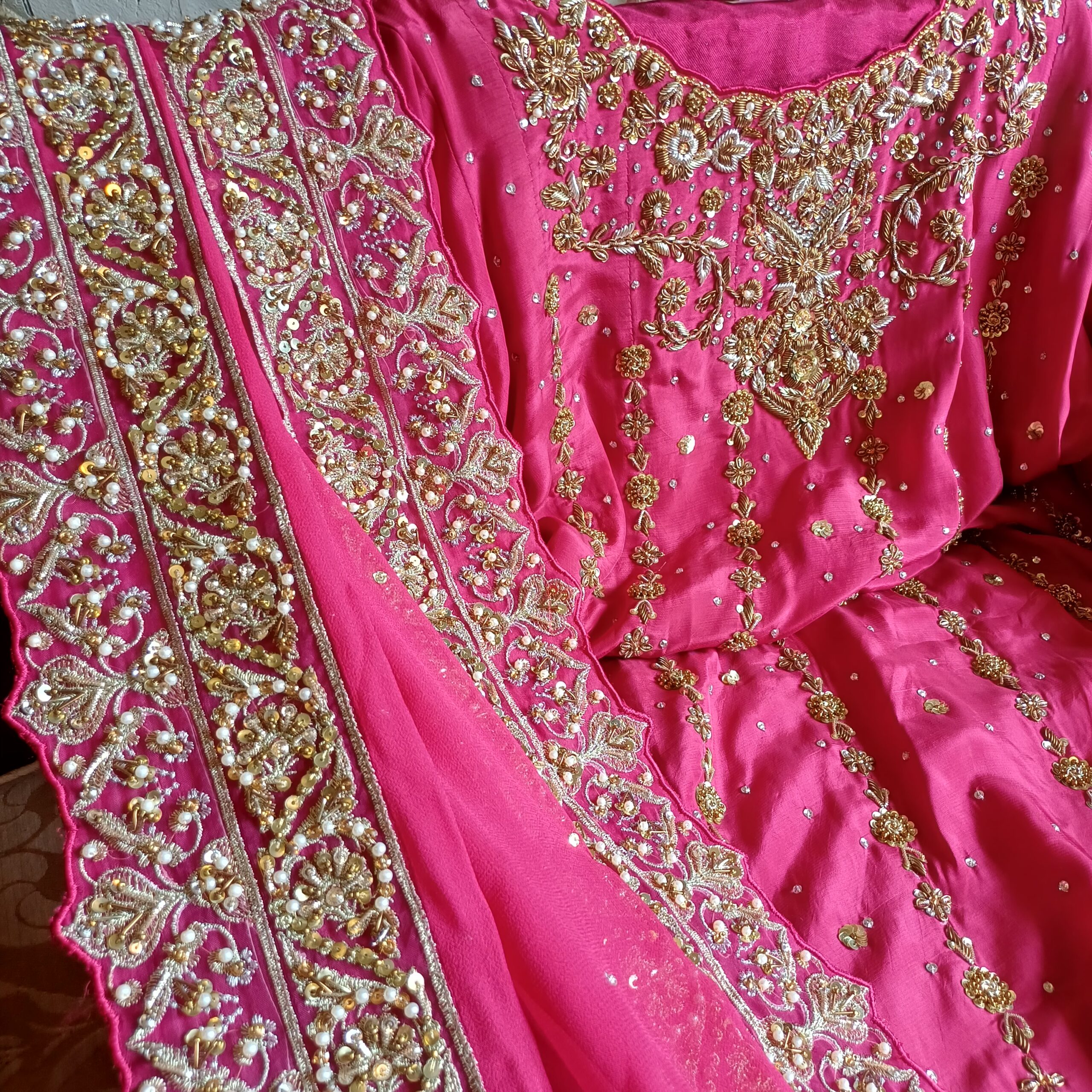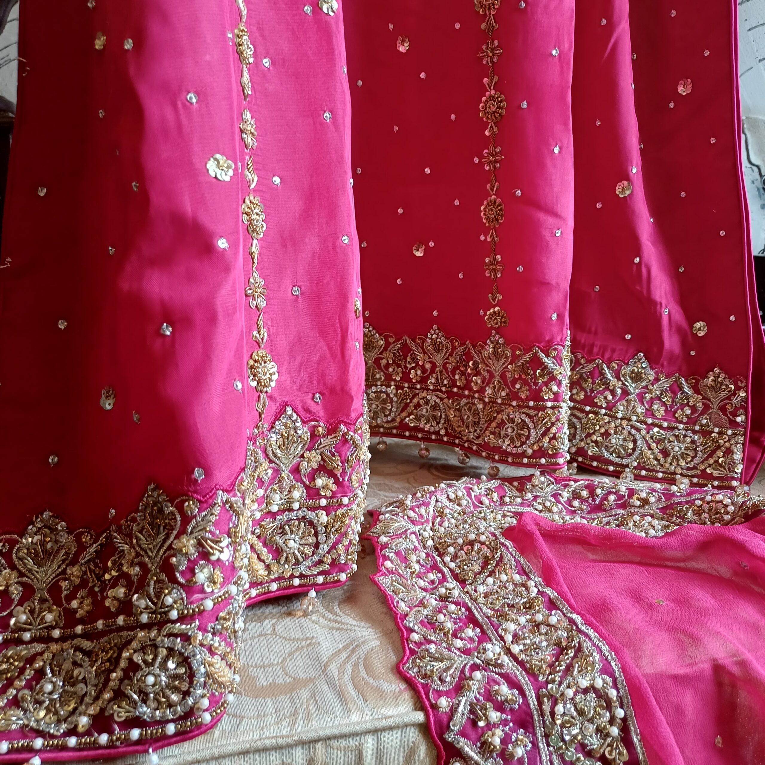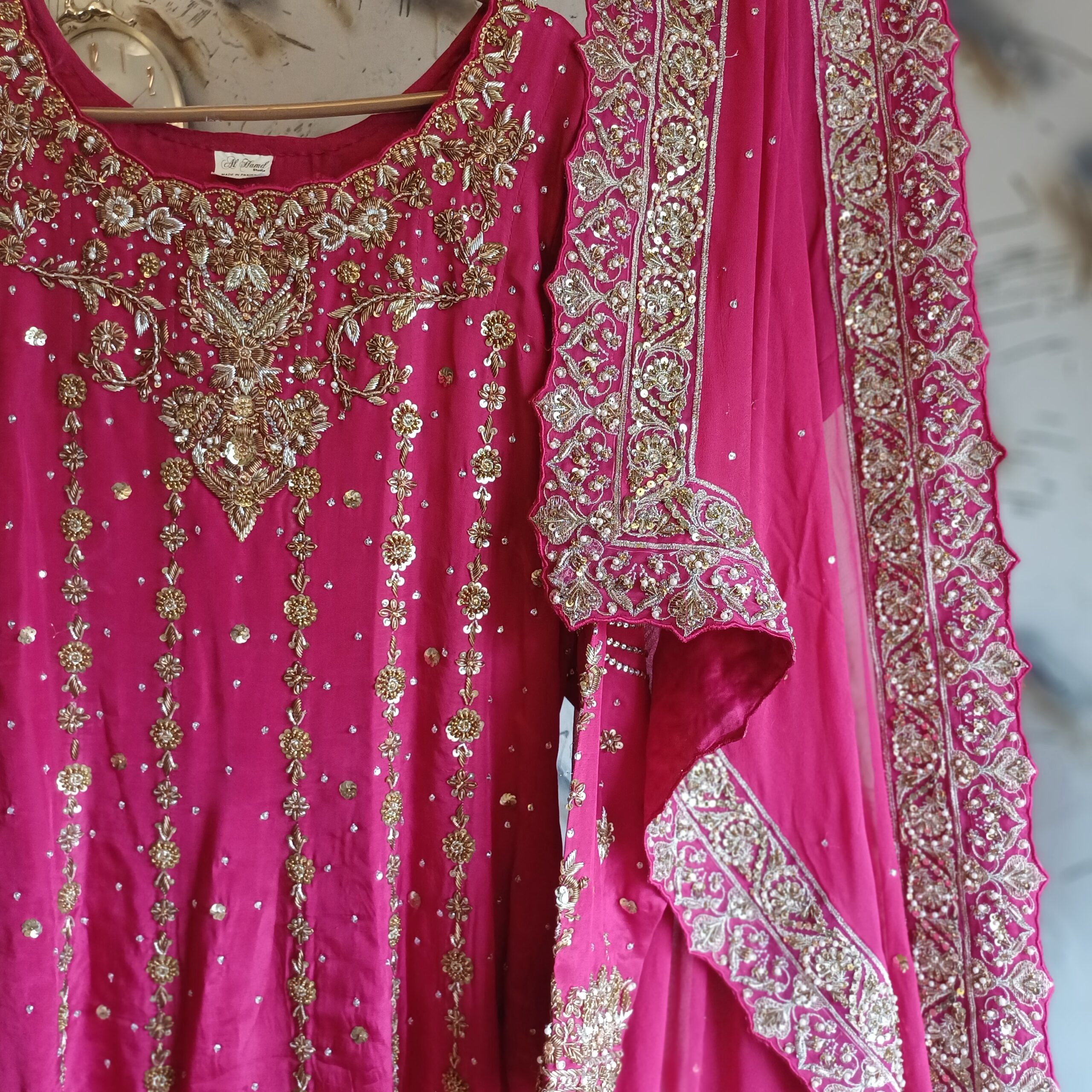 A graceful candy pink A-line shirt, beautifully detailed with hand embroidery on the neckline, sleeves, and daman. The dupatta is fully finished with four-side embroidery and delicate scallops, adding a soft, elegant touch.
