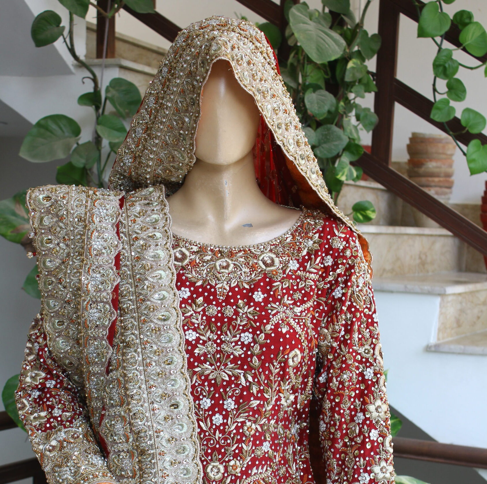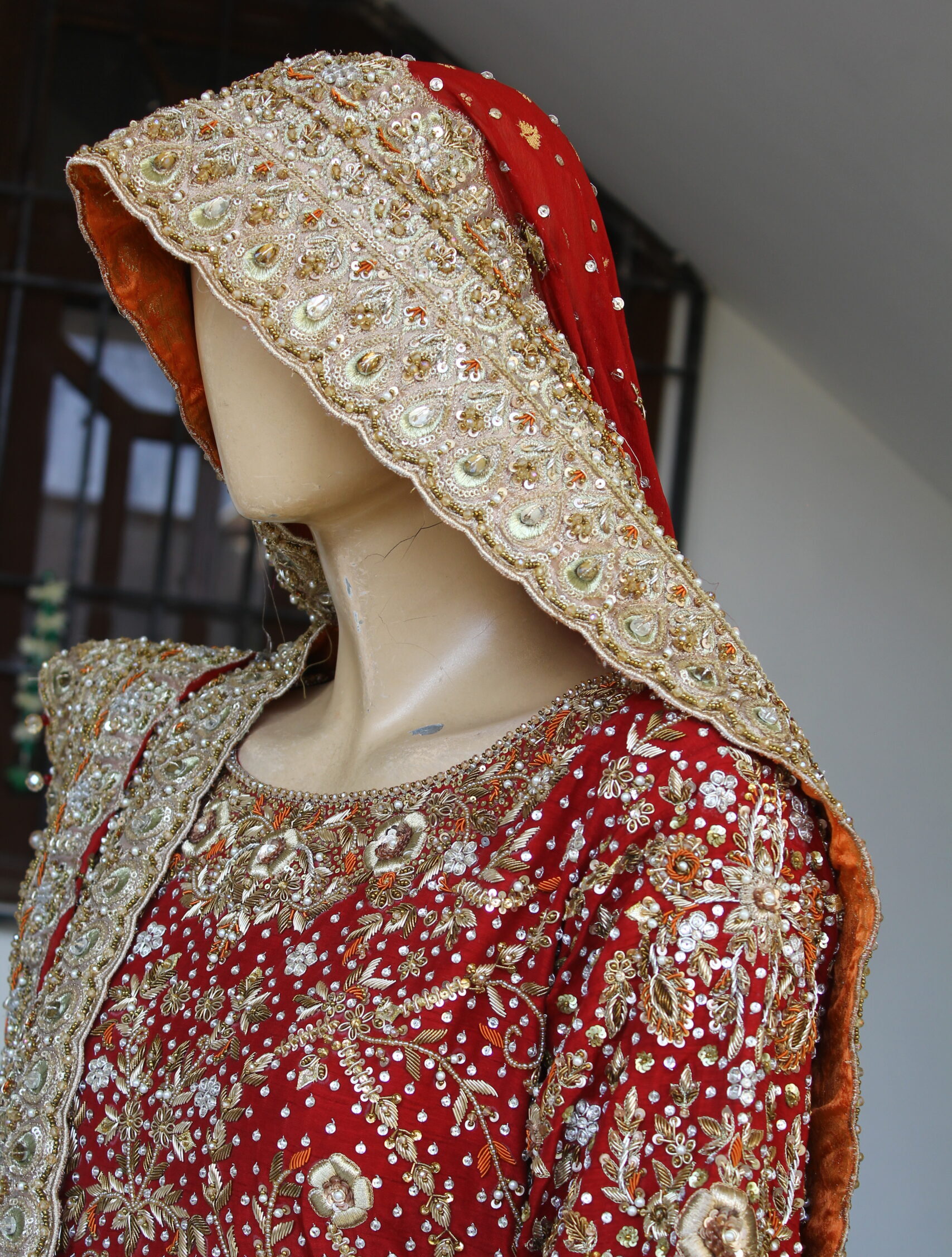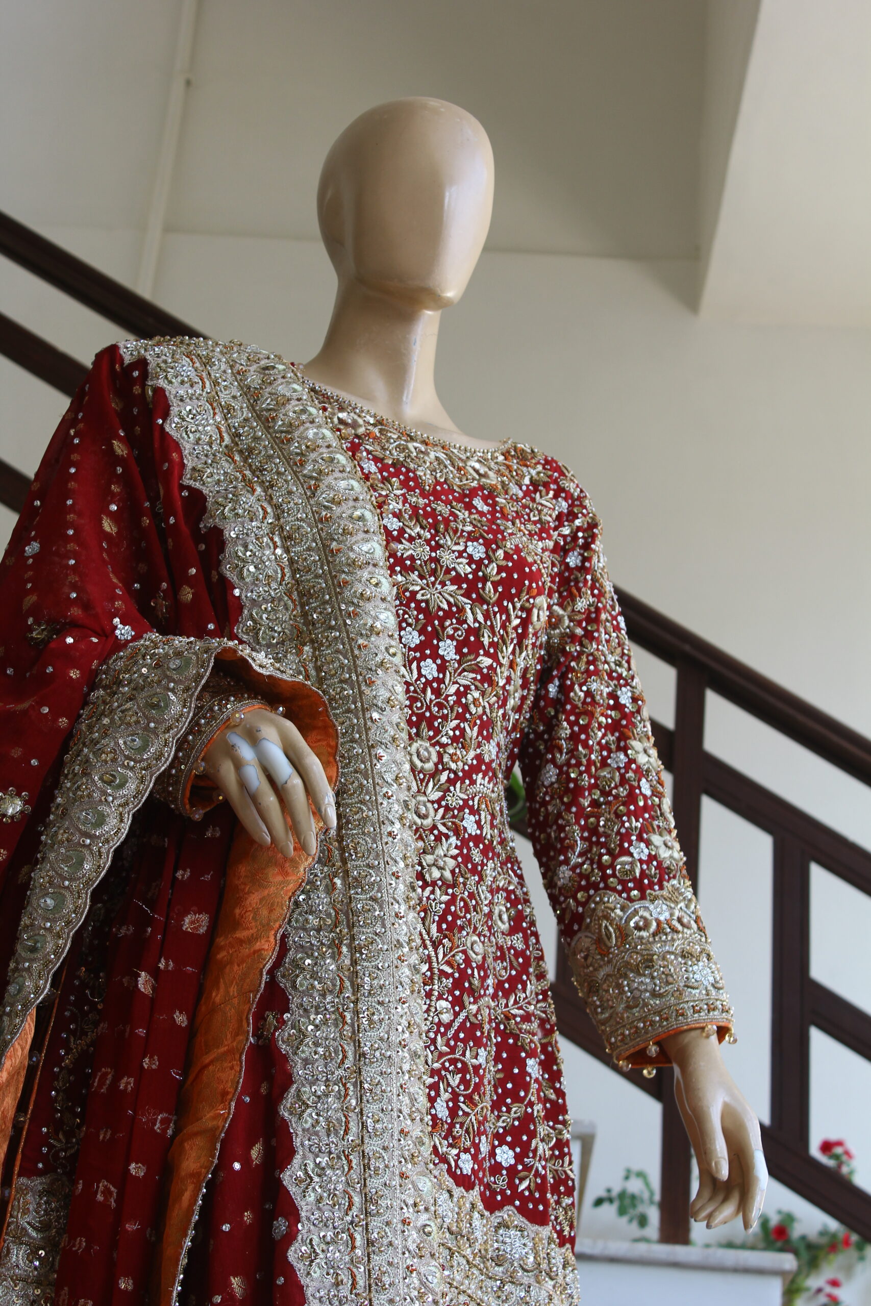 The bridal ensemble features a rich blood red base, exuding timeless elegance and depth. The shirt is intricately adorned with copper kora work, further elevated by delicate dull gold embroidery that adds a vintage charm. To enhance the texture and opulence, the design is embellished with a blend of white and gold stones, salma, and rudt accents. Paired with this is a contrasting rust-colored jamavar farshi garara, which brings warmth and regality to the look, intricately worked to mirror the detailing of the choli. Completing the outfit is a deep maroon dupatta, crafted from a heavier, structured fabric to lend richness and form. It features an elaborate four-sided border with copper kora, dull gold threadwork, and stone embellishments, with minimal scattered motifs across the body for a balanced finish. Together, the pieces create a luxurious, well-composed bridal look that blends traditional artistry with refined elegance.