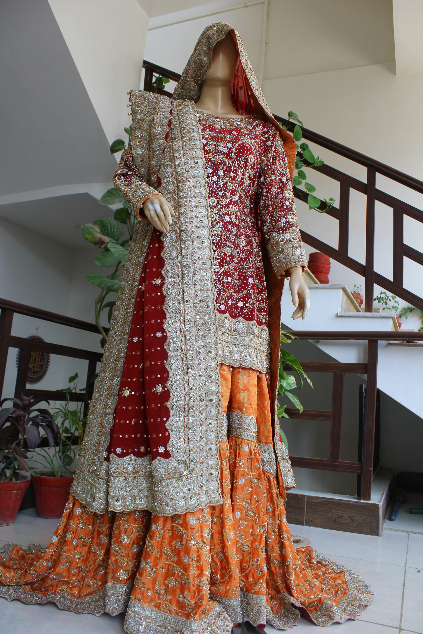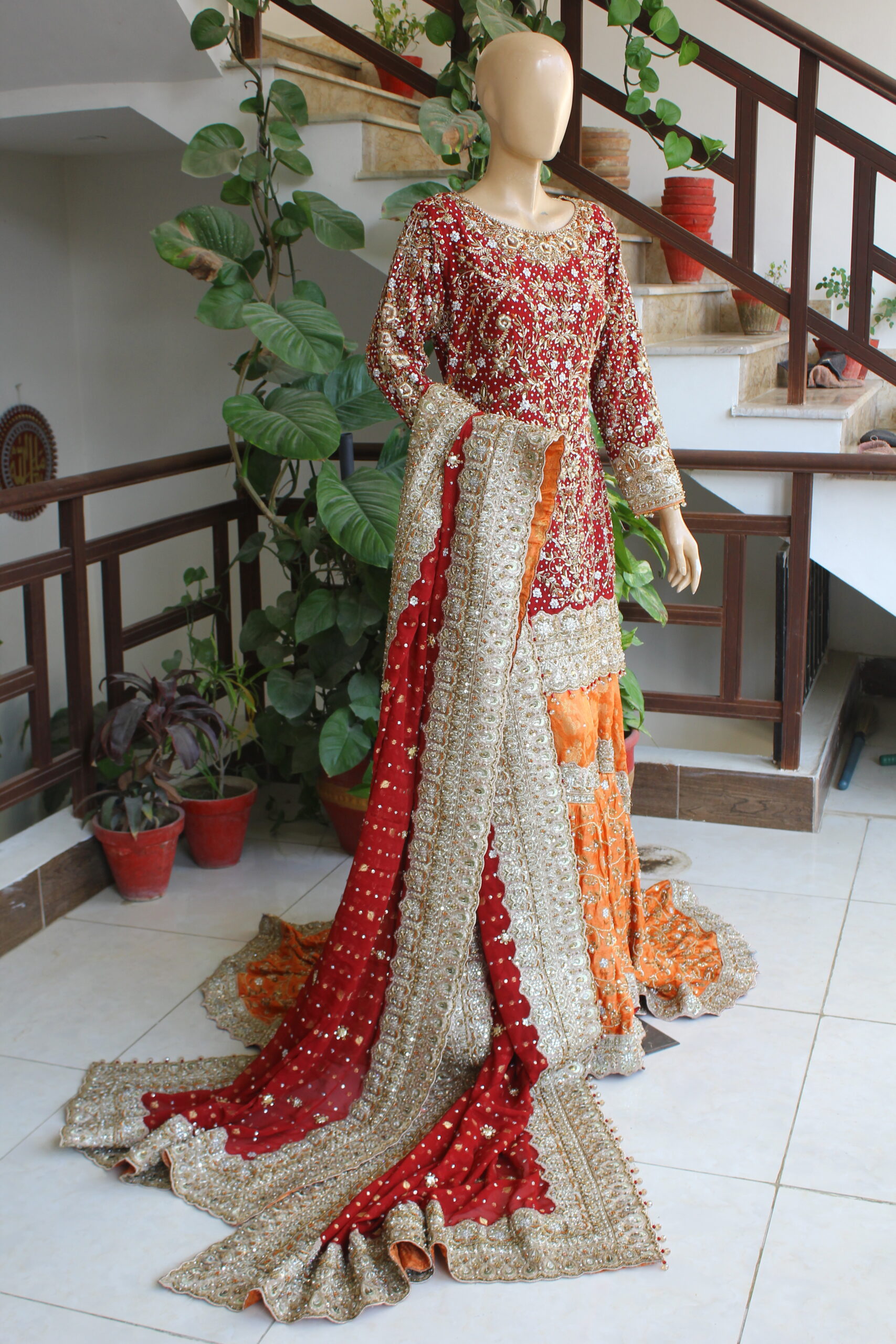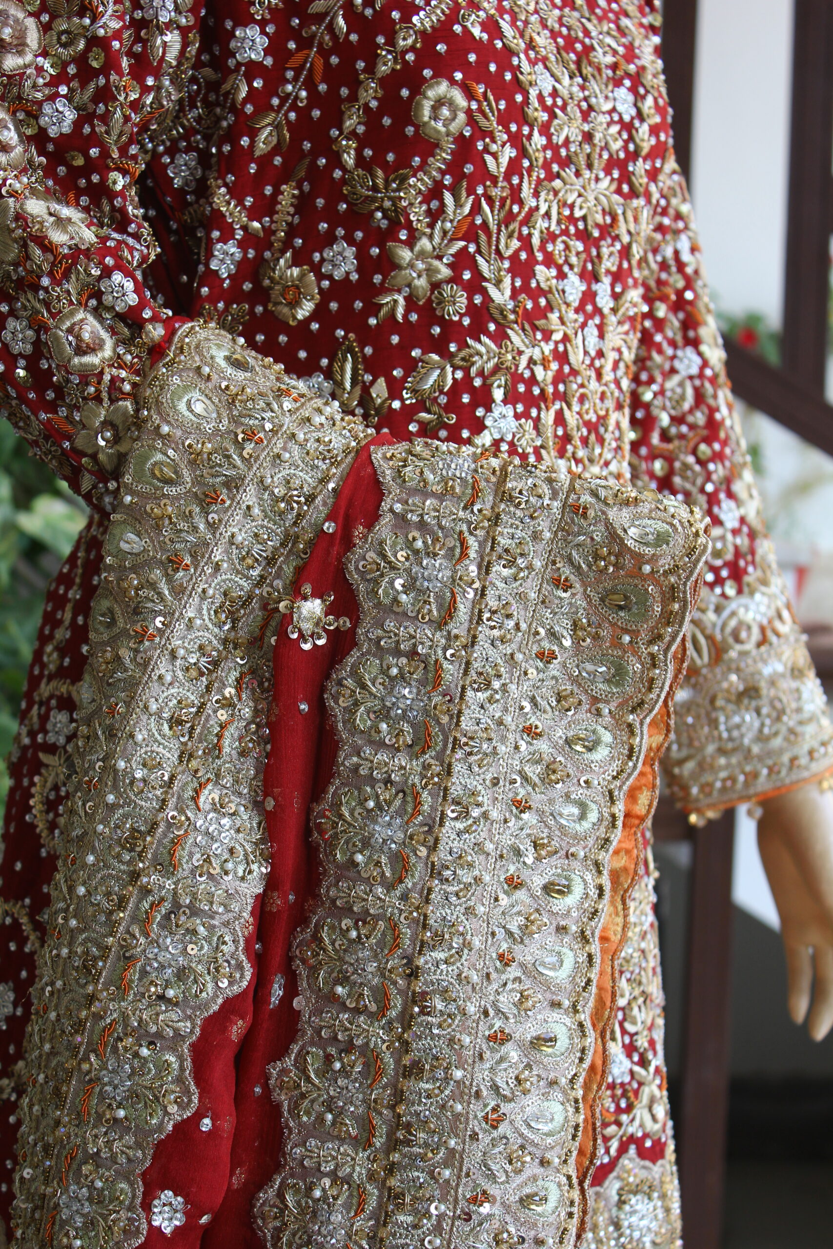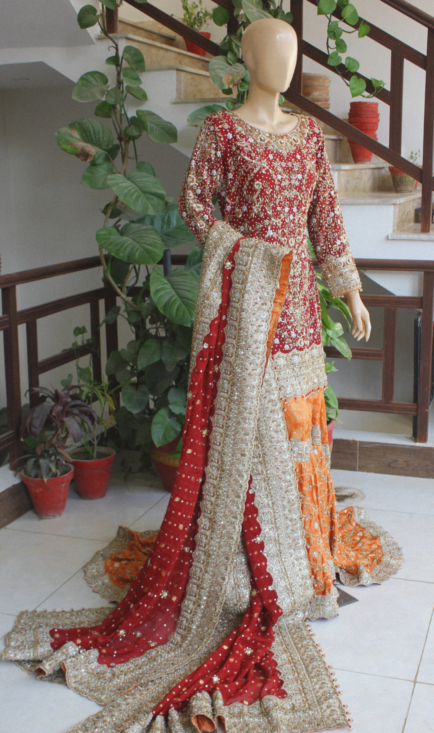 The bridal ensemble features a rich blood red base, exuding timeless elegance and depth. The shirt is intricately adorned with copper kora work, further elevated by delicate dull gold embroidery that adds a vintage charm. To enhance the texture and opulence, the design is embellished with a blend of white and gold stones, salma, and rudt accents. Paired with this is a contrasting rust-colored jamavar farshi garara, which brings warmth and regality to the look, intricately worked to mirror the detailing of the choli. Completing the outfit is a deep maroon dupatta, crafted from a heavier, structured fabric to lend richness and form. It features an elaborate four-sided border with copper kora, dull gold threadwork, and stone embellishments, with minimal scattered motifs across the body for a balanced finish. Together, the pieces create a luxurious, well-composed bridal look that blends traditional artistry with refined elegance.